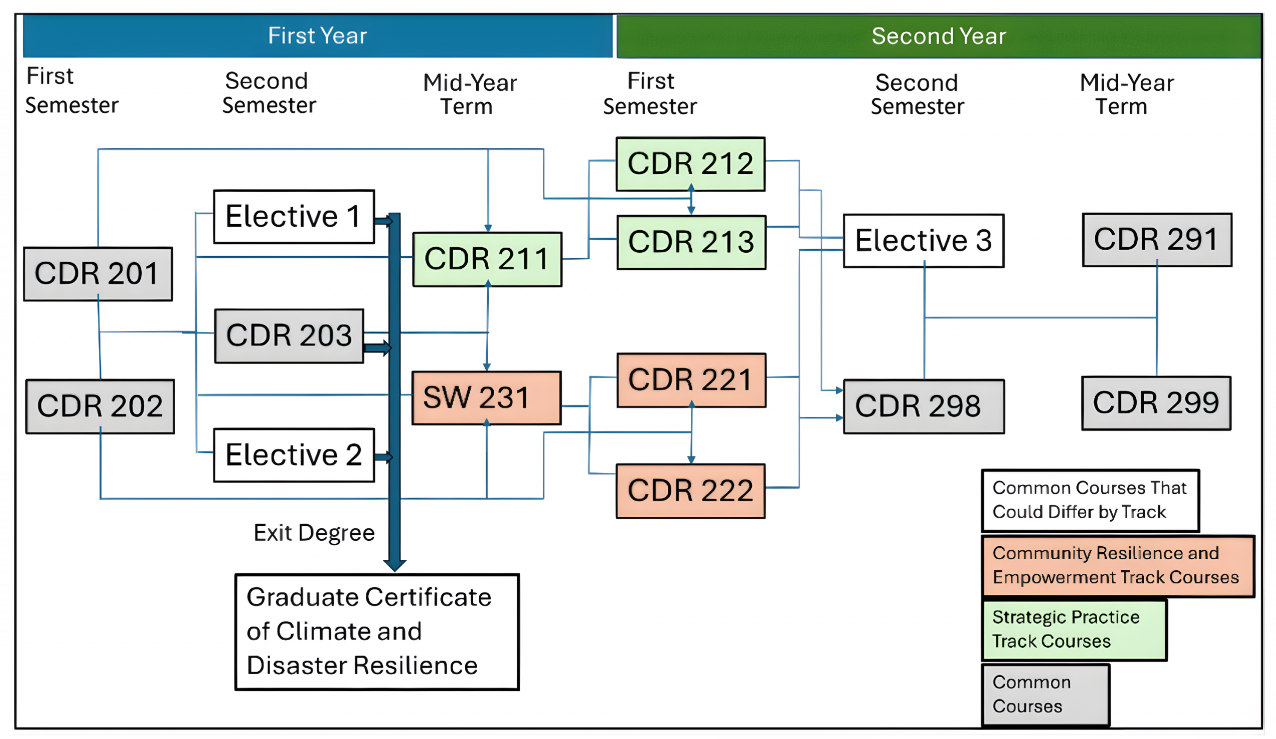 Students who have completed 15 units of coursework, consisting of the first 3 core courses and 2 elective courses, have the option to exit the program and receive a Graduate Certificate in Climate and Disaster Resilience (GCCDR) degree.