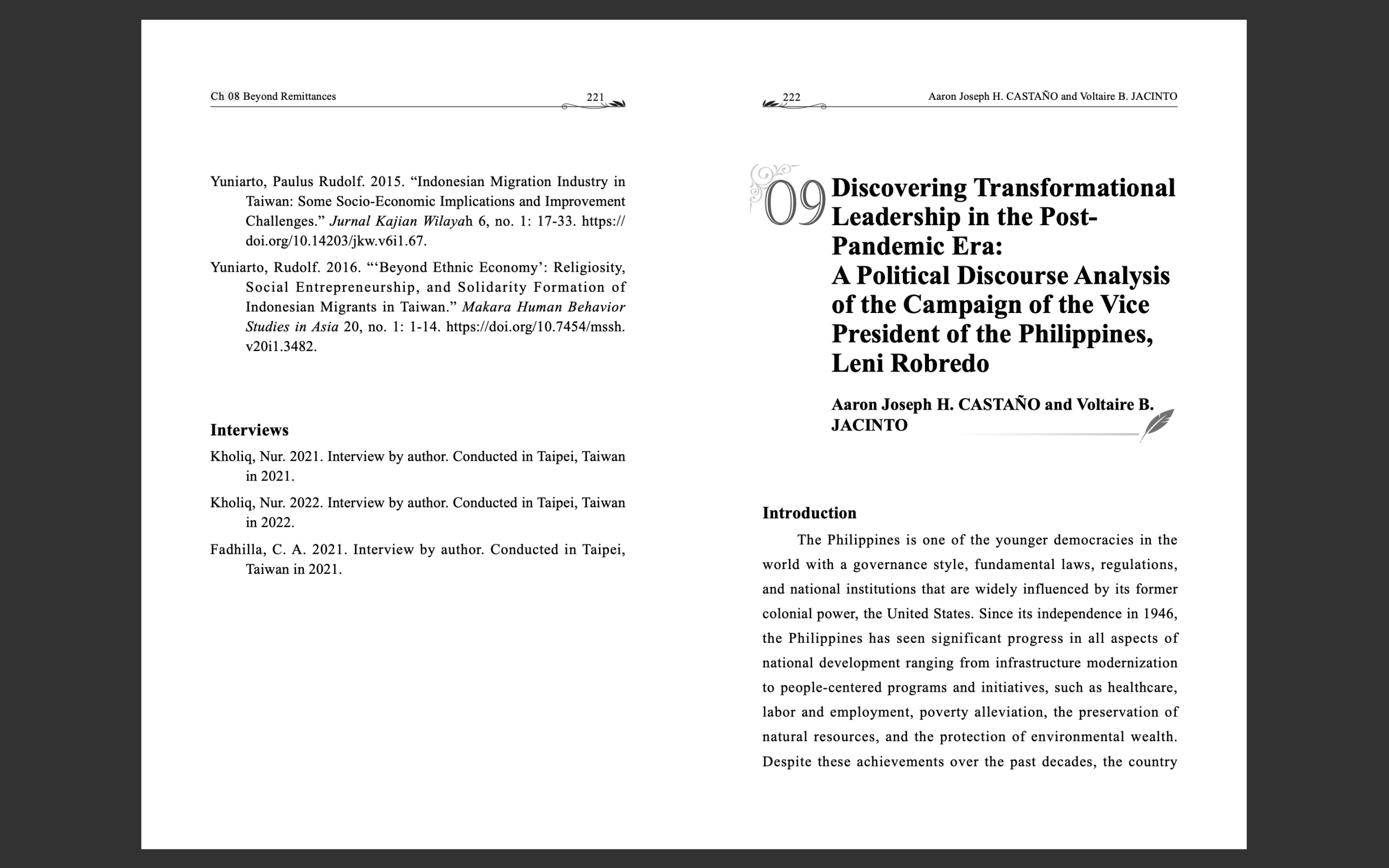 In addition, Mr. Castaño published a chapter in the book Southeast Asia: Interests and Discontents, released by Wenzao Ursuline University Press. He co-authored the chapter “Discovering Transformational Leadership in the Post-Pandemic Era: A Political Discourse Analysis of the Campaign of the Vice President of the Philippines, Leni Robredo.”