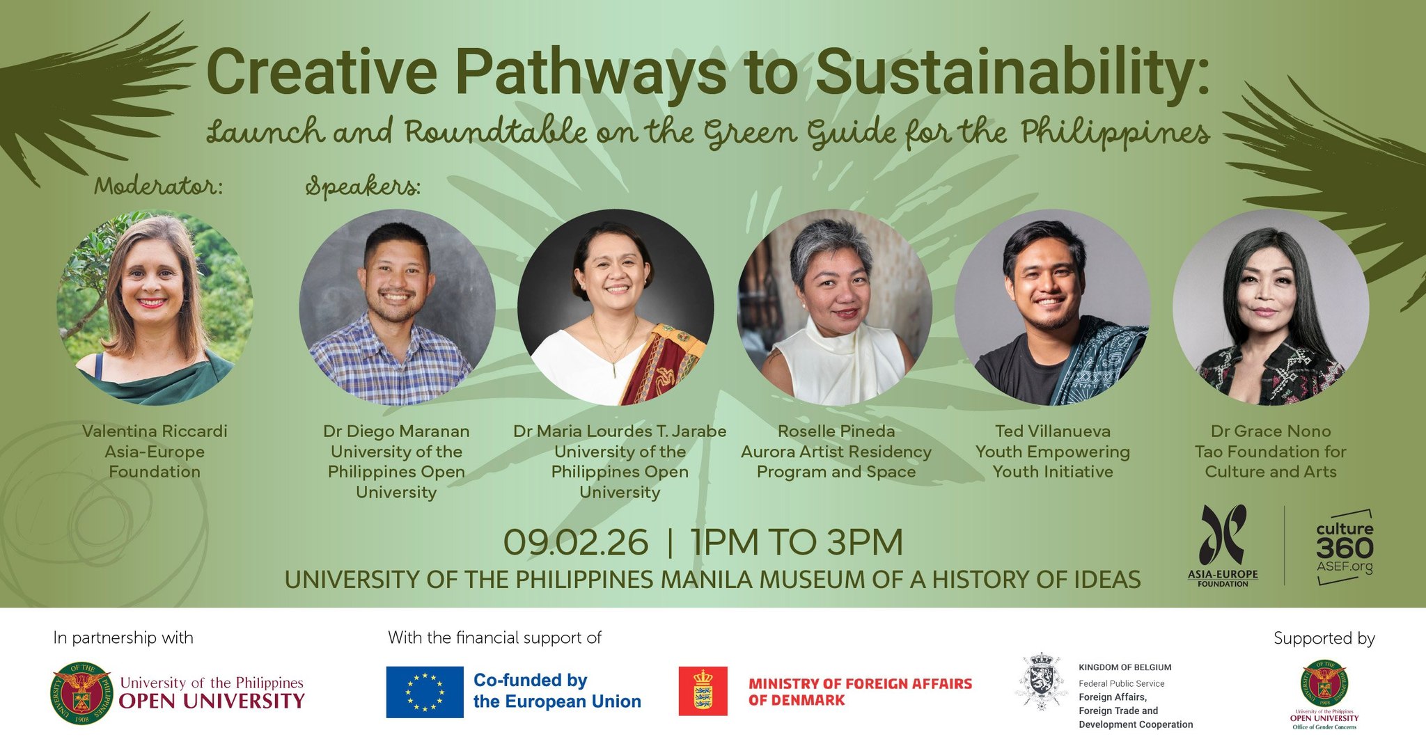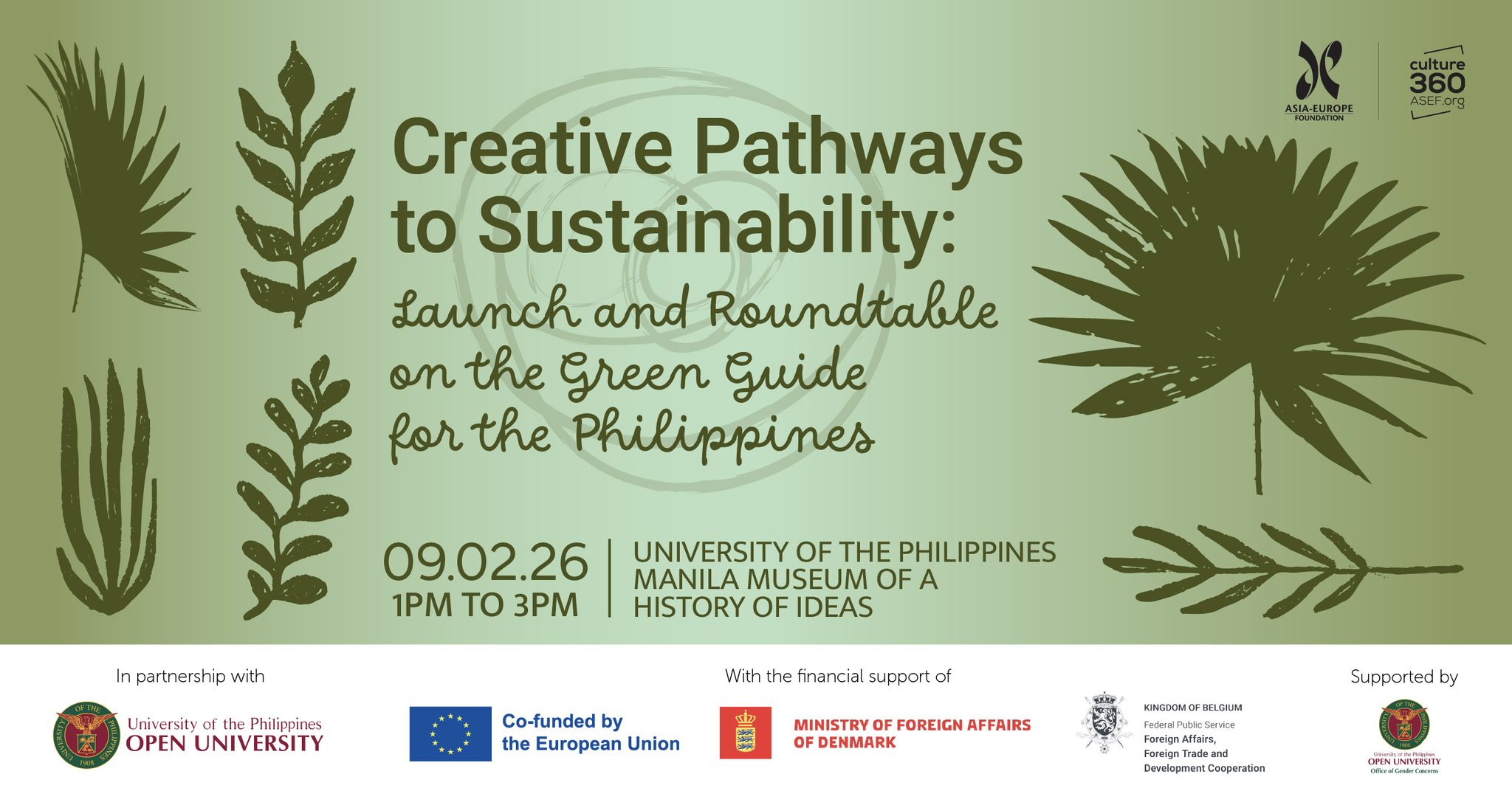The University of the Philippines Open University (UPOU), through the Faculty of Management and Development Studies (FMDS) and Faculty of Information and Communication Studies (FICS), in partnership with the Asia-Europe Foundation (ASEF) Culture, invites you to the hybrid event in celebration of the National Arts Month 2026 entitled “Creative Pathways to Sustainability: Launch and Roundtable on the Green Guide for the Philippines”.