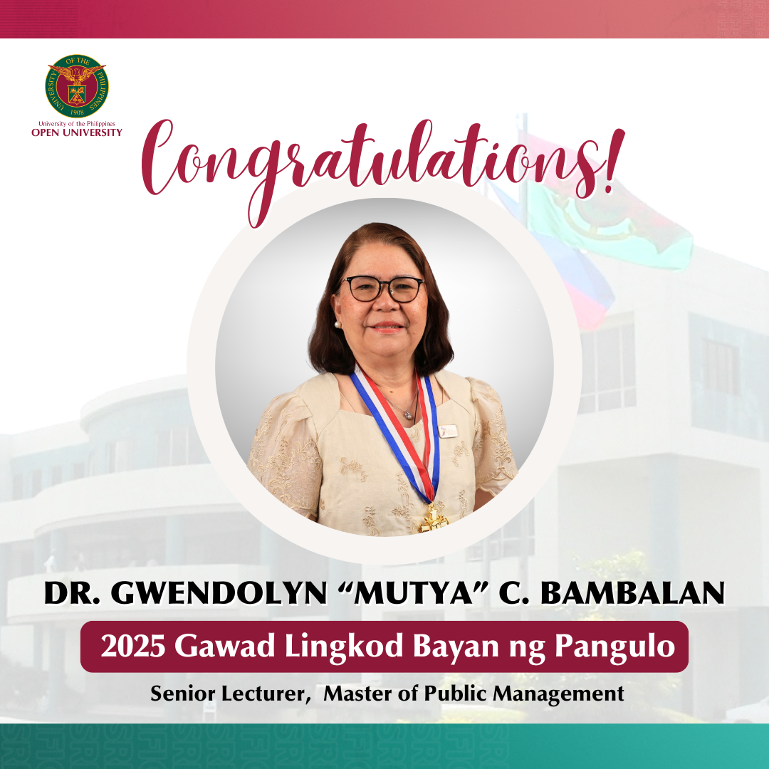 The Faculty of Management and Development Studies (FMDS) Master of Public Management (MPM) Program congratulates Dr. Gwendolyn “Mutya” C. Bambalan, DPA, CESO III, Senior Lecturer of Voluntary Sector Management, for being named one of the “12 Natatanging Lingkod Bayan” and conferred the 2025 Gawad Lingkod Bayan ng Pangulo, the highest recognition for exemplary public service under the Civil Service Commission’s (CSC) Honor Awards Program (HAP).