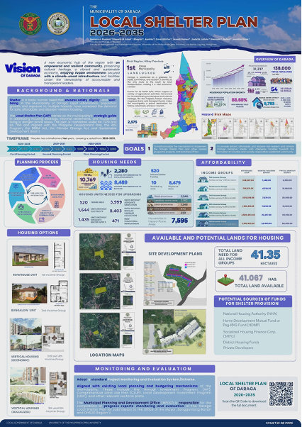 The project’s output include a detailed 125-page LSP document featuring sections like the pertinent data and overviews;  shelter resources and needs; proposed housing programs, projects, and activities; timeline and corresponding financial allocations; and monitoring and evaluation schemes. An informational poster that visually captures the plan’s essence: LGU profile, hazard exposure maps, shelter needs breakdown, affordable housing options, and the cyclical planning process integrating disaster risk reduction (DRR) and climate change adaptation (CCA), was also produced.