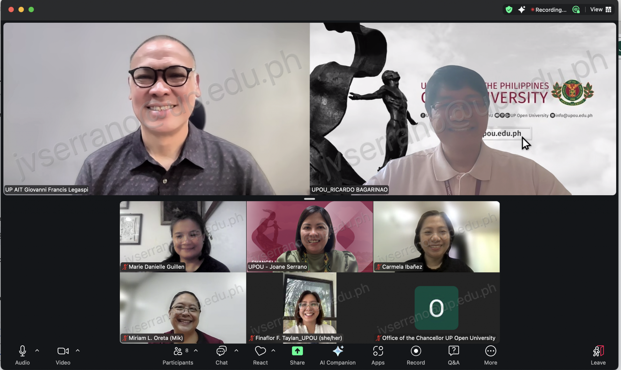 The meeting was attended by UPOU officials, including Dr. Joane V. Serrano, Chancellor of the UPOU; Dr. Finaflor F. Taylan, Dean of the FMDS; and Dr. Ricardo Bagarinao, Program Chair of the DSus Program. Representatives from the UP Asian Institute of Tourism (AIT) also joined the discussion, including Asst. Prof. Giovanni Francis A. Legaspi, Dean of AIT; Asst. Prof. Maria Carmela M. Ibañez, Officer-in-Charge of the Office of the Institute Secretary; Asst. Prof. Miriam Salvacion L. Oreta, Director of the Division of Academic Affairs, and Dr. Marie Danielle V. Guillen, Associate Professor of AIT.